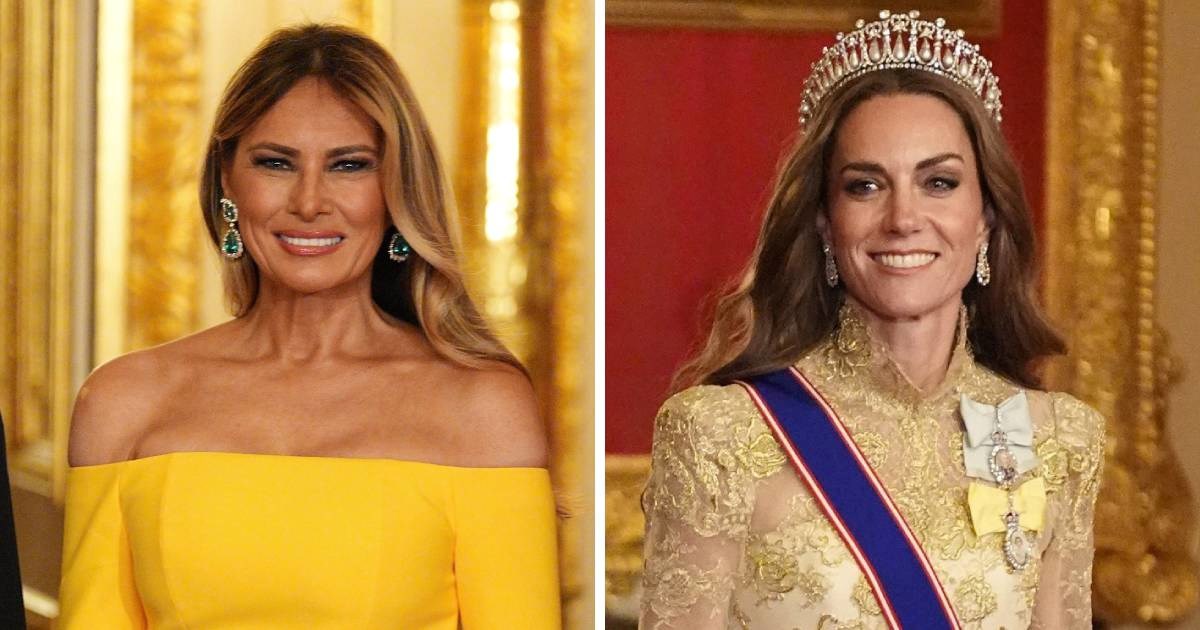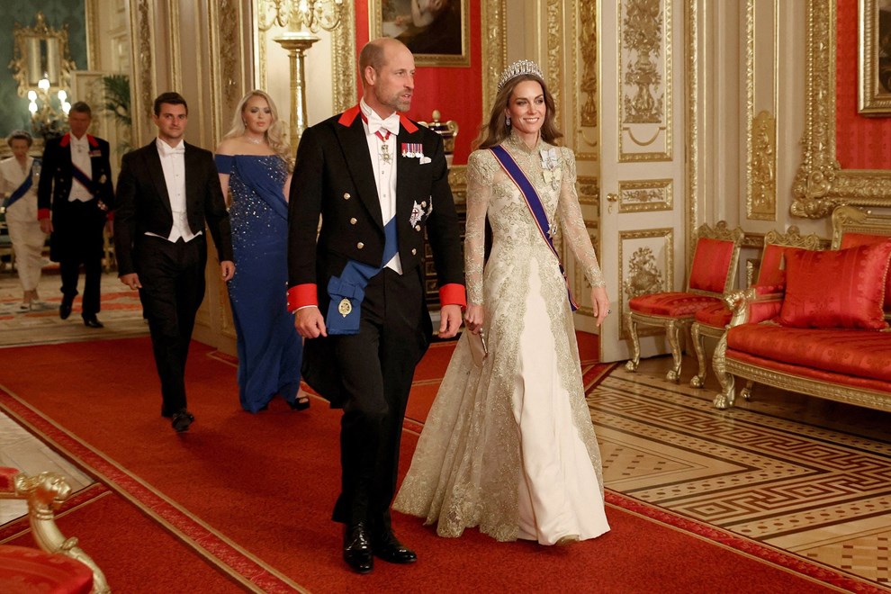 Princeza od Walesa za državni banket odjenula je haljinu britanske dizajnerice Phillipe Lepley s ručno izvezenom zlatnom čipkom. Izgled je upotpunila svojom omiljenom kraljevskom tijarom, poznatom kao Queen Mary's Lover's Knot. Iako je od udaje za princa Williama 2011. godine nosila četiri različite tijare, upravo je ova njezin najčešći odabir za svečane prigode poput državnih banketa i diplomatskih primanja.