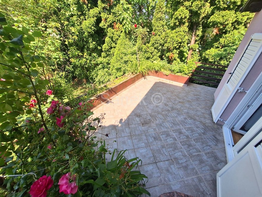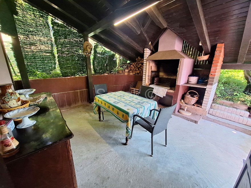 Kuhinja ima izlaz na stražnju terasu s roštiljem i prostorom za objedovanje. U oglasu se navodi da je okućnica uređena i ograđena radi potpune privatnosti. Iza kuće nalazi se dio pogodan za vrt ili voćnjak.