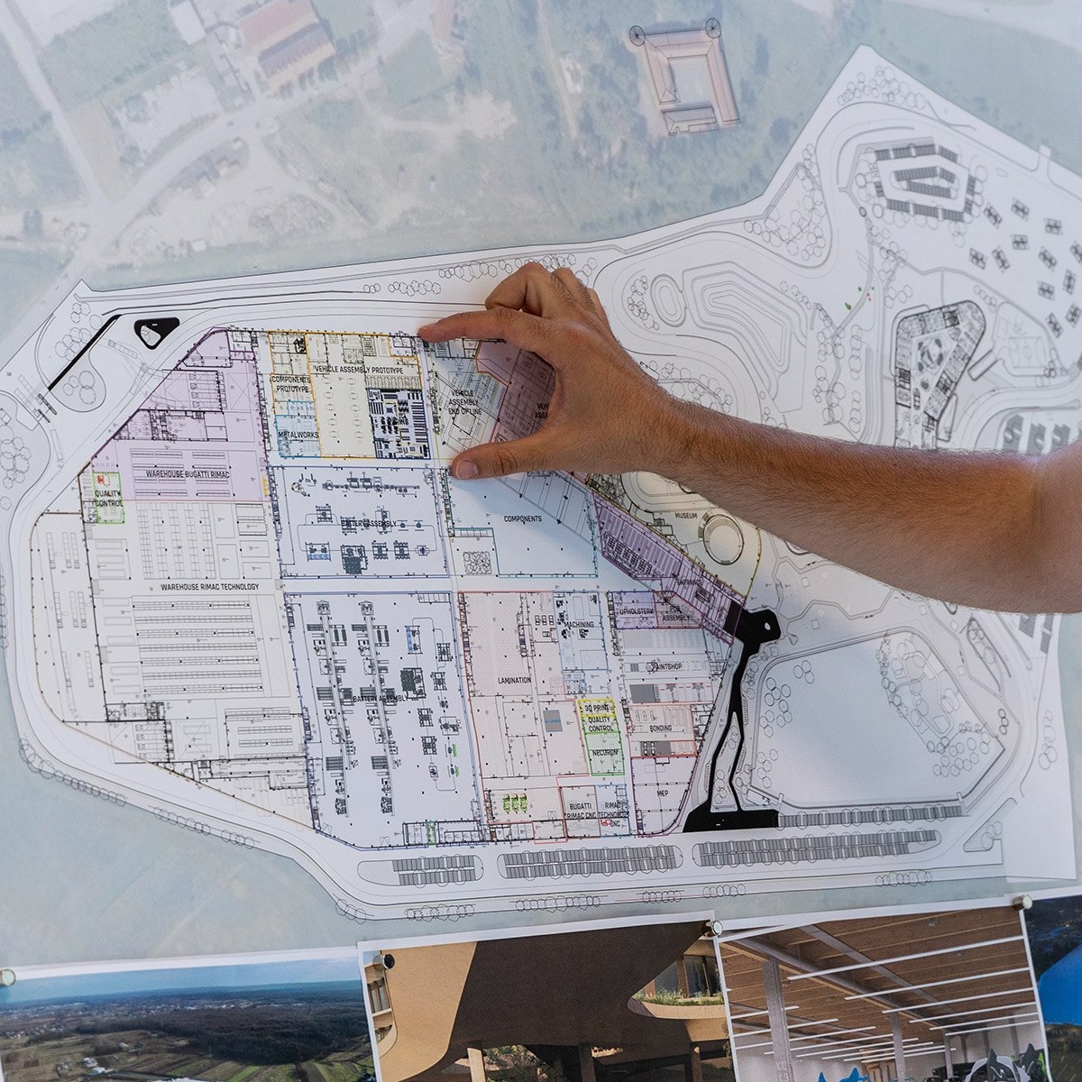 Pokazuje nam tlocrte kampusa te nacrte onoga što se još planira graditi kad je riječ o proširenju kampusa i još jednoj mogućoj lokaciji blizu njega. "Ziđamo dalje", šali se. Sve se to tiče postojećih potreba. Naime, dok smo razgovarali o planovima, Rimac nam je iskreno rekao: "Jednu stvar sam sebi obećao, nećemo ništa novo pokretati. Imamo dovoljno stvari koje moramo završiti."