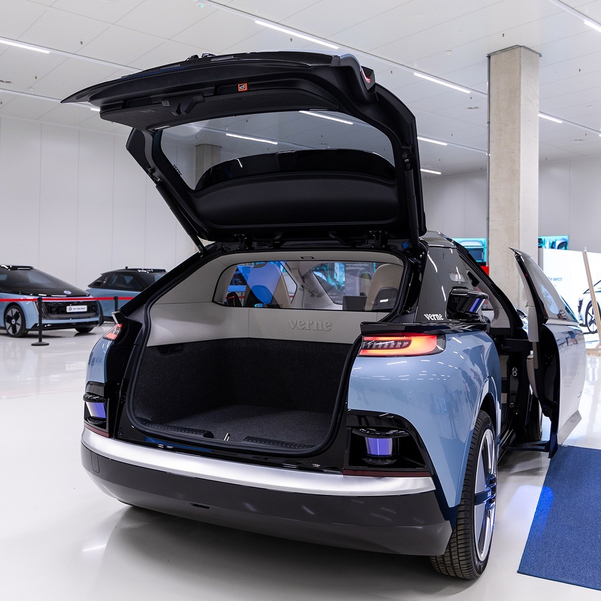 Oko nas je šest prototipova robotaksija, od kojih je jedan i onaj koji se nije htio mrdnuti na predstavljanju Verne robotaksija prije mjesec dana. On zauzima centralnu poziciju u hali, dok su ostali prototipovi poredani uz zid.