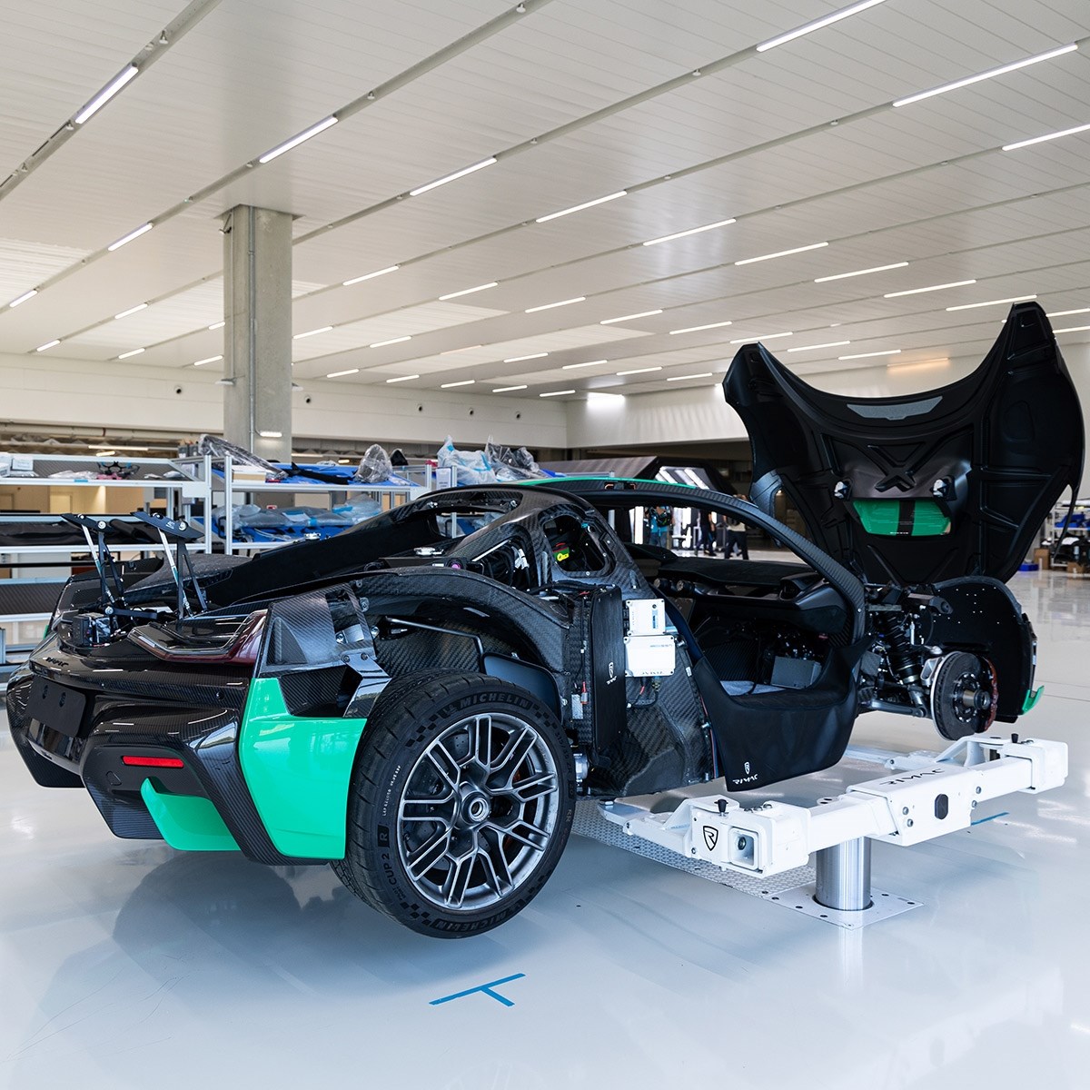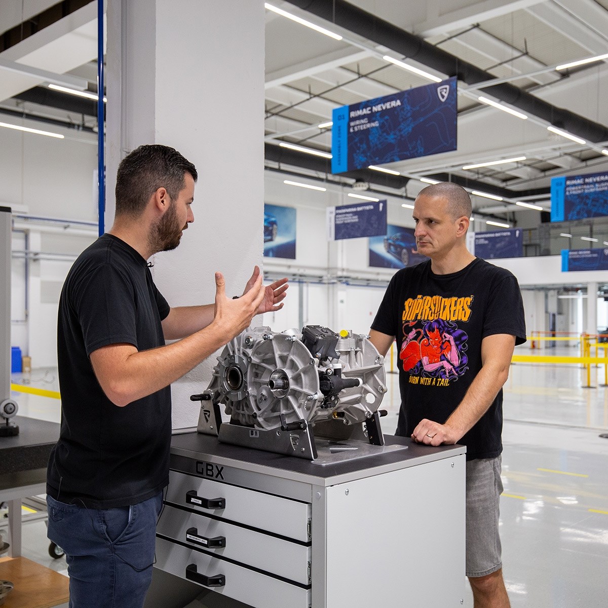 Ističe da je sav razvoj najnovijeg Bugattijevog superautomobila u Hrvatskoj i da su ovdje svi inženjeri, kao i sjedište, razvoj i proizvodnja komponenti, dok se u Francuskoj samo sklapa automobil. Zadovoljno dodaje da je napredak u proizvodnji konstantan. Pokazuje nam pogon novog Bugatti Tourbillona i objašnjava kako je gotovo upola manji od Neverinog.