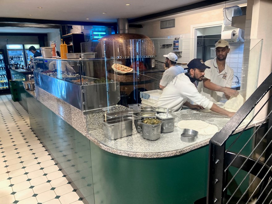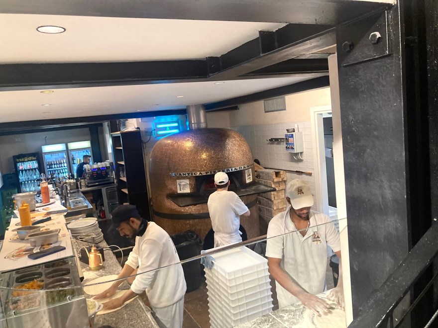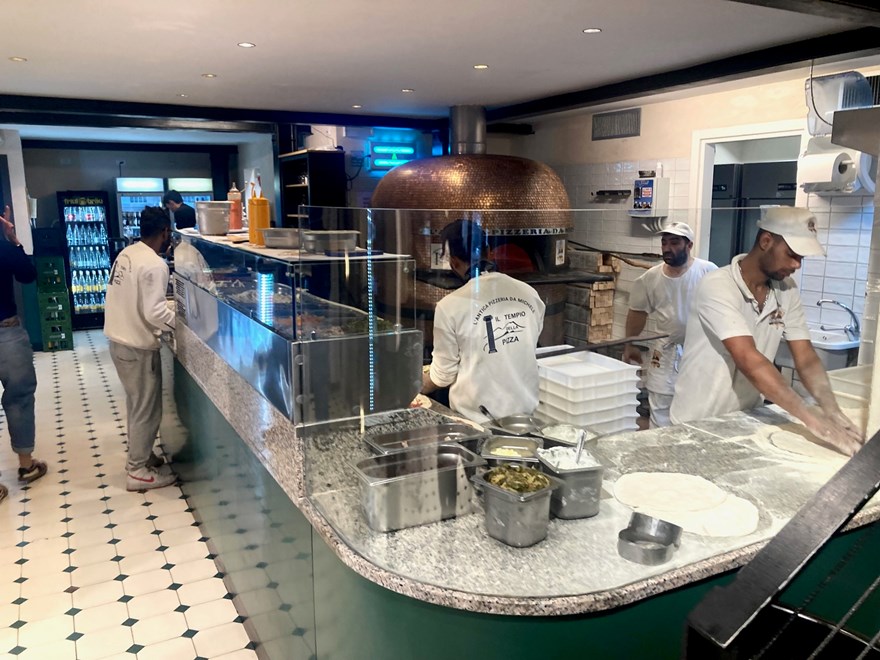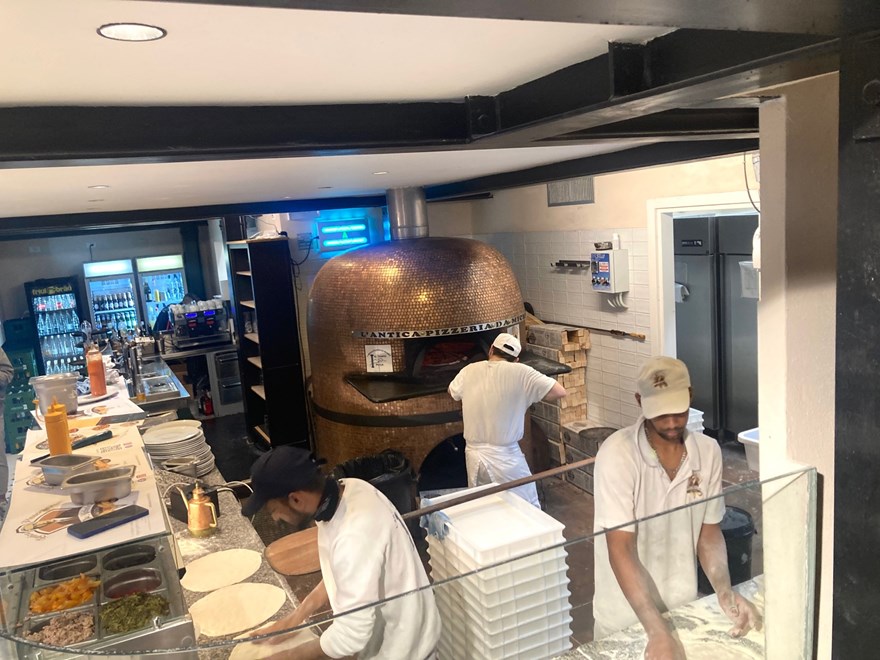 A onda sam desetak minuta promatrao tri iskusna pizza majstora i shvatio zašto nema dužeg čekanja. Iskusni je pizza majstor koji radi na peći u tih desetak minuta ispekao dvadesetak pizza. Istovremeno se u peći nalaze tri ili četiri pizze, a čim bi jednu pizzu nakon minute i pol izvukao iz peći odmah je sljedeću stavljao unutra. Nama su pizze na stol stigle nakon dvadesetak minuta.