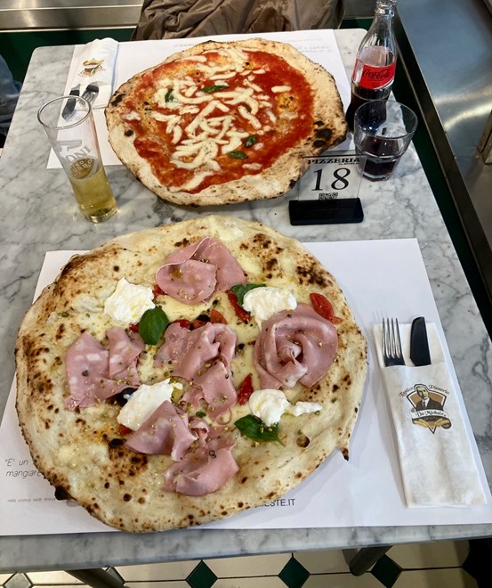 Ova pizzerija ima puno veći izbor pizza. Osim tradicionalnih Margherite, Marinare, Cosacce i Marite u ponudi je i veći broj gurmanskih pizza, a samu Margheritu prave i poslužuju u šest varijacija. Naravno, među gurmanskim se pizzama nalazi i moja omiljena pizza s mortadelom koju sam i naručio, ali sam zbog toga prvi put zažalio. Uz Mortadella e Stracciatella naručili smo i običnu Margheritu.