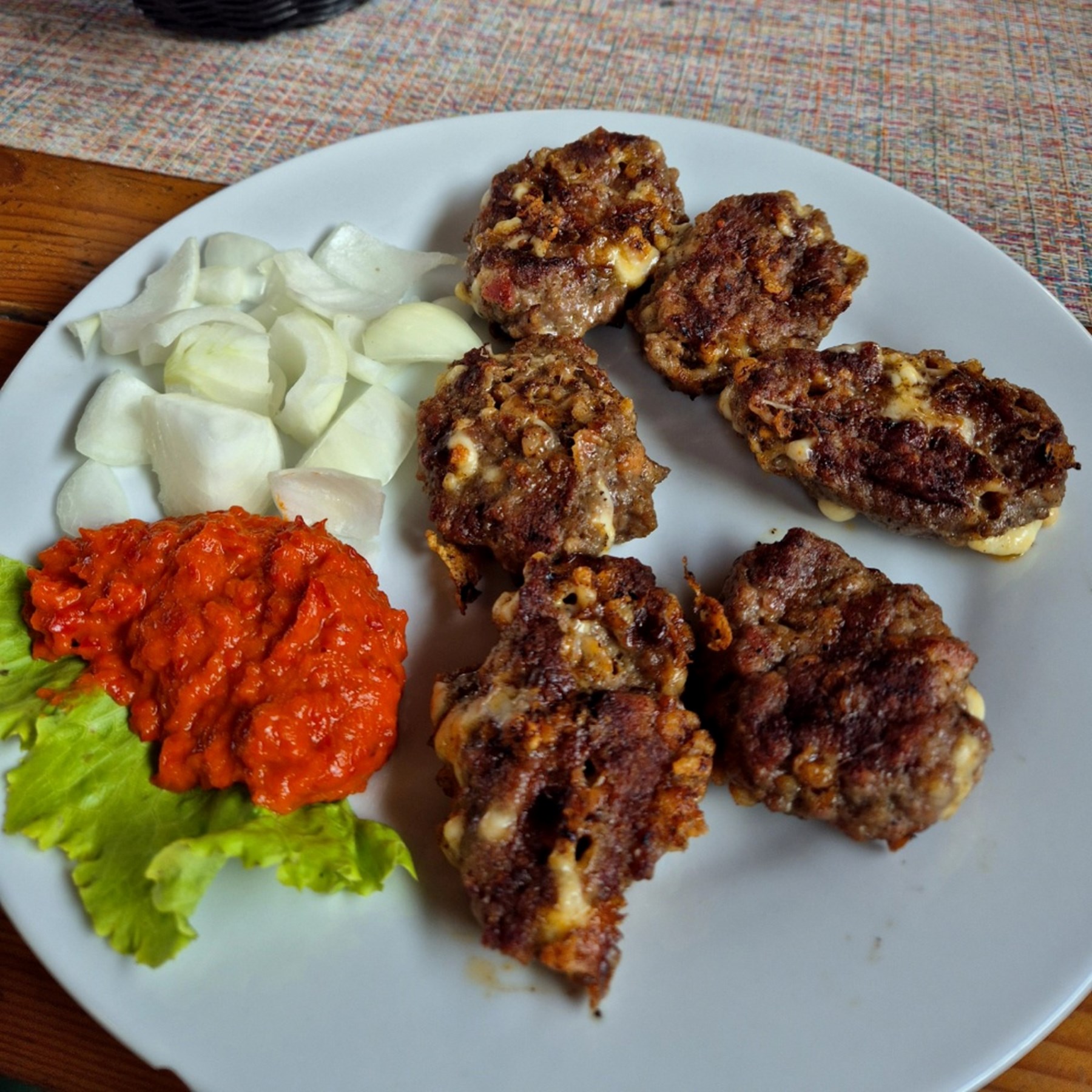 Uz to smo naručili i uštipke punjene sirom. Lagano su pikantni, ništa previše, što nam se svidjelo, i taman su zapečeni da iznutra ostanu sočni, a izvana hrskavi. I uz njih smo dobili hrpu luka, ajvar i lepinju, a dodatan plus ide za lepinje, koje su bile savršeno sočne i na stol su nam stigle još vruće.