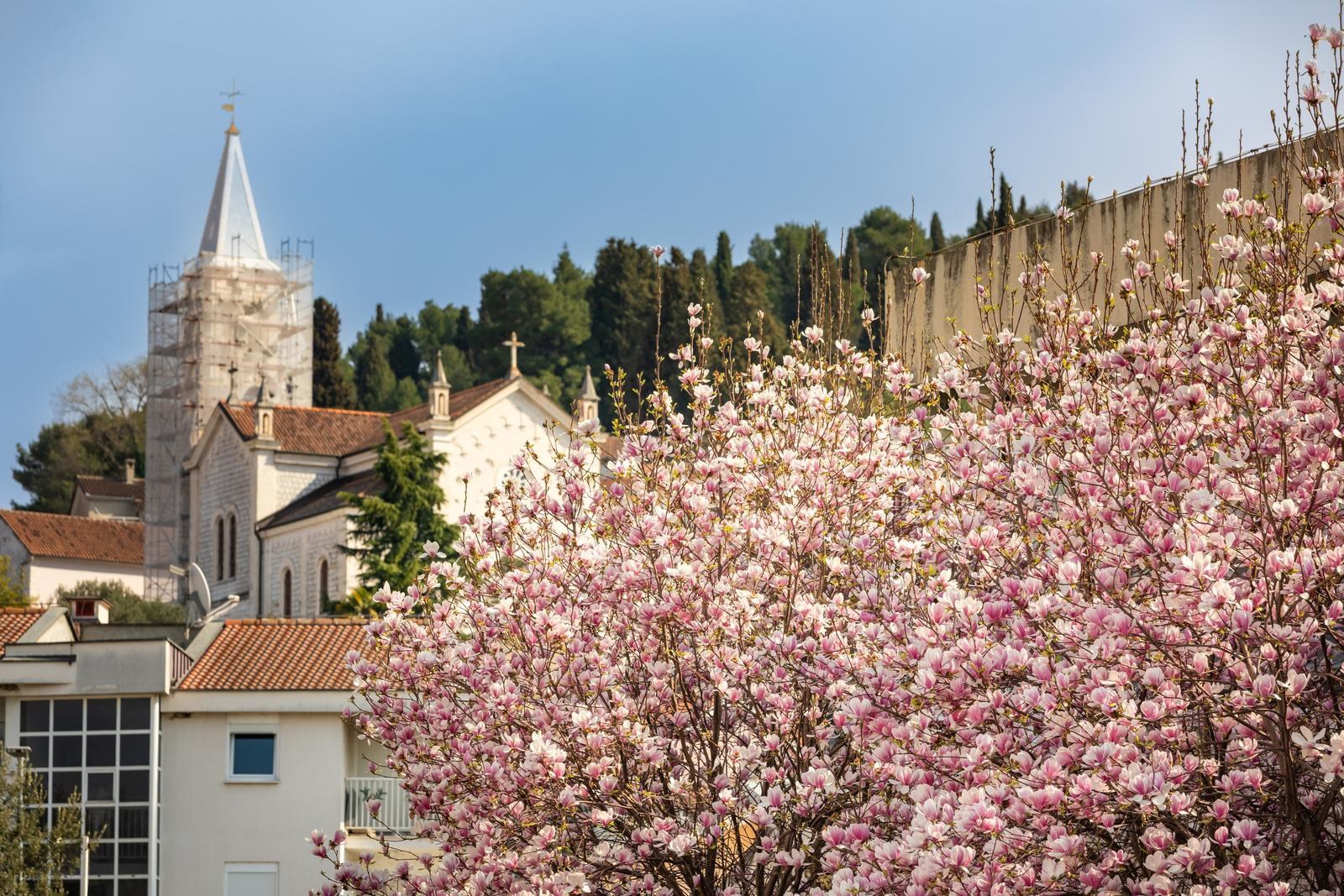 Stabla magnolije, prekrivena nježnim ružičastim pupoljcima i cvjetovima, stvaraju pravi proljetni ugođaj u tom dalmatinskom gradu.