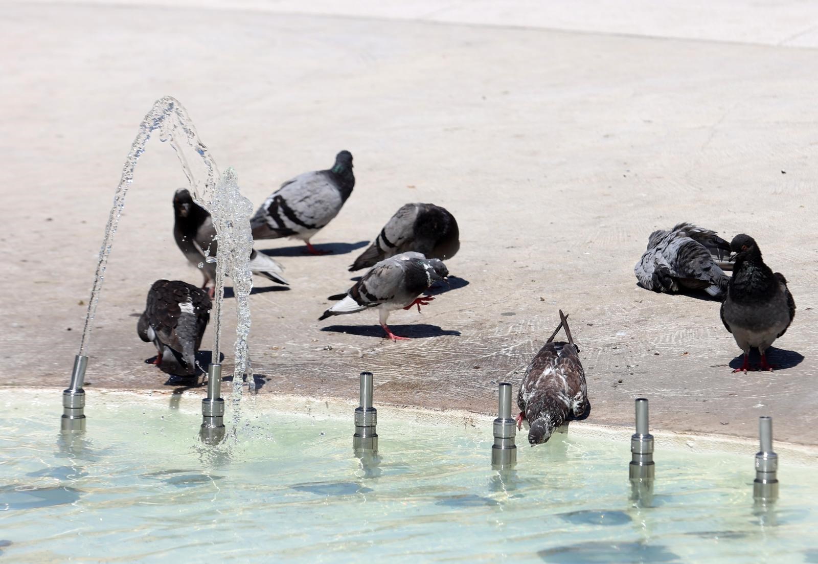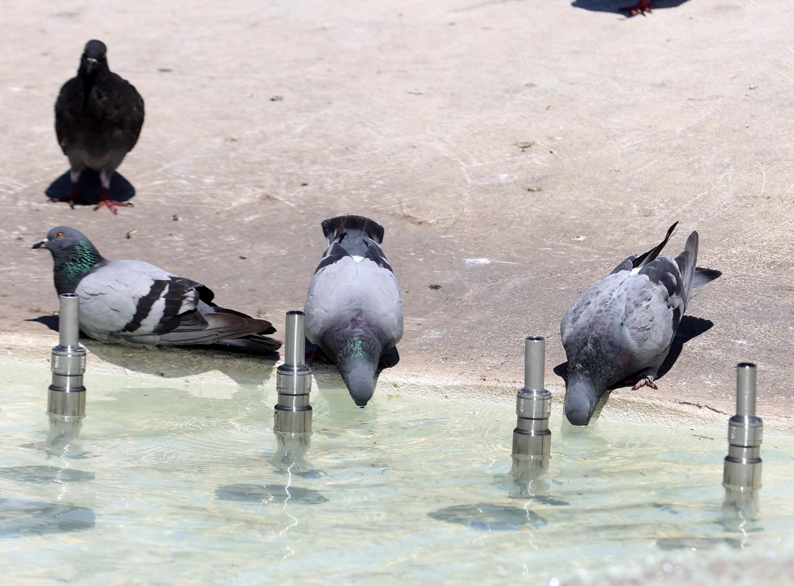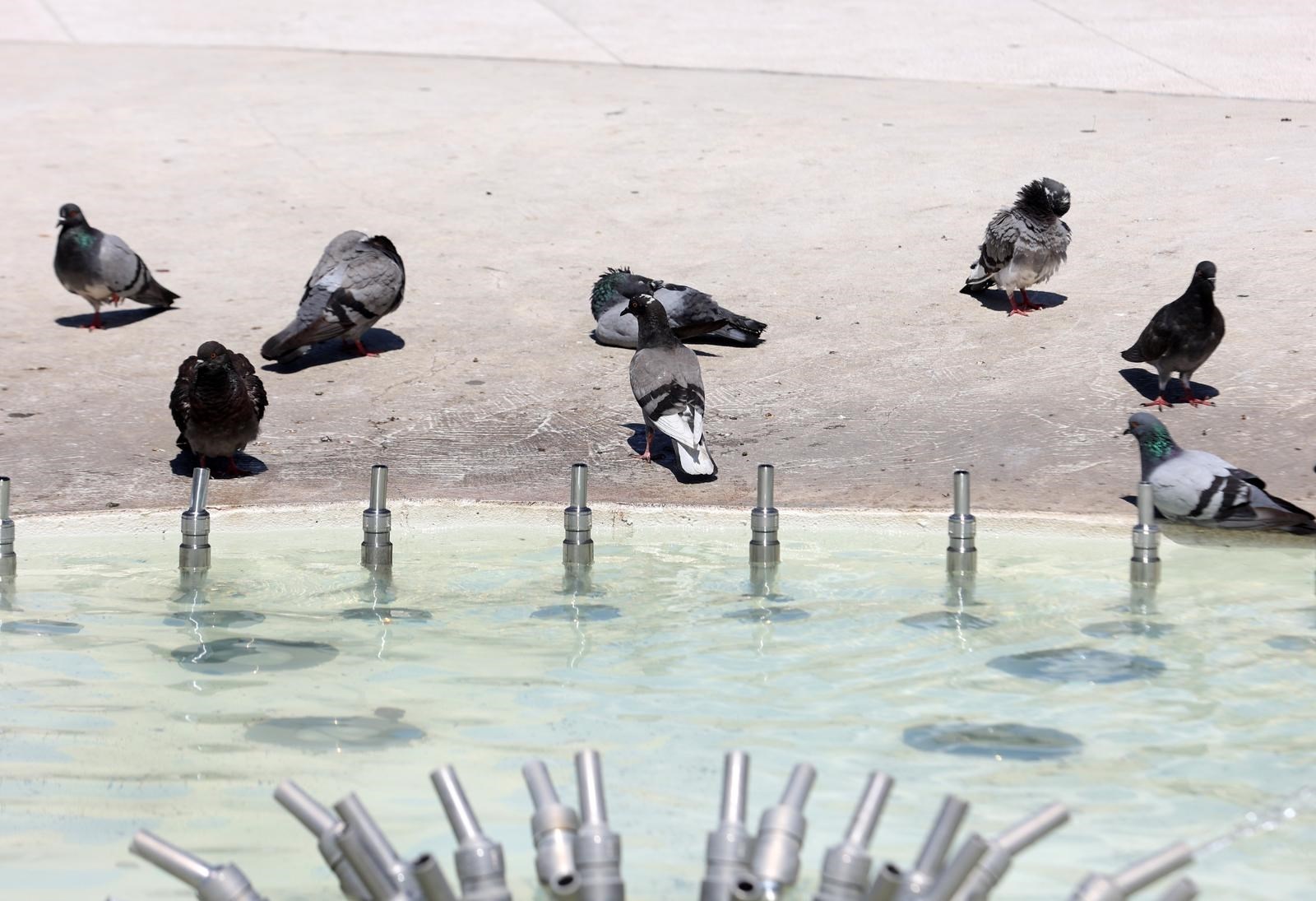 Ljudi traže hlad i piju puno tekućine, a u Šibeniku su ovih dana žedni i - golubovi. Fotografi su snimili simpatičan prizor kod vodenog sata na šibenskoj Poljani gdje se hrpa golubova okupila i pila vodu.