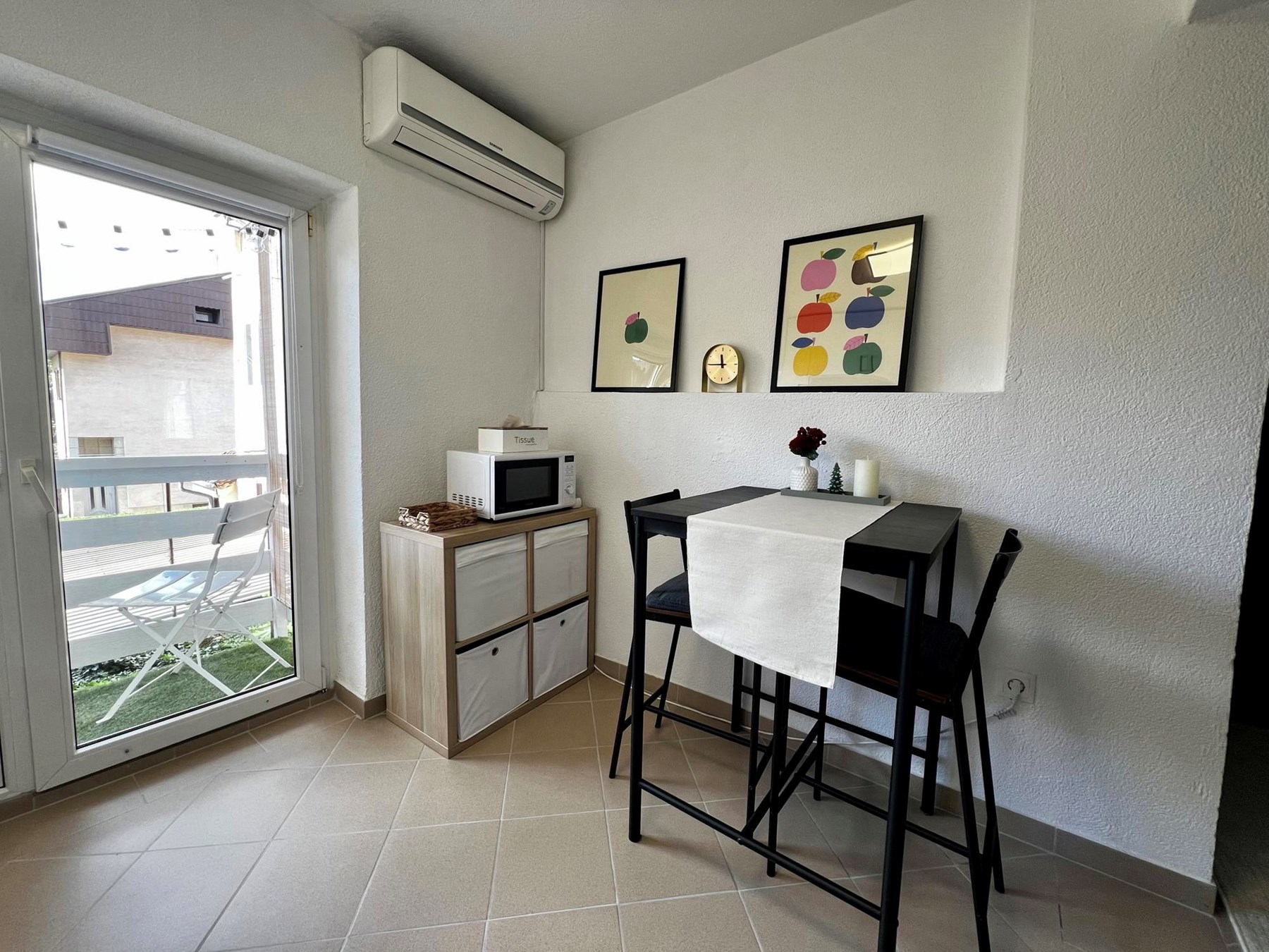 Garsonijera je dvostrano orijentirana (istok-zapad), što joj, prema oglasu, osigurava obilje prirodne svjetlosti tijekom cijelog dana. Sastoji se od hodnika, dnevnog boravka, kuhinje, kupaonice i balkona. Prostor je funkcionalno organiziran i maksimalno iskorišten.