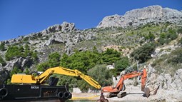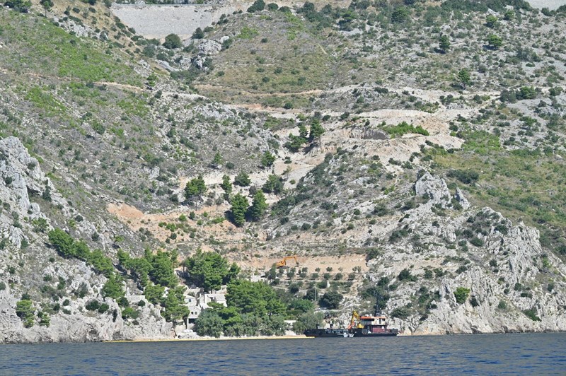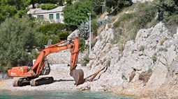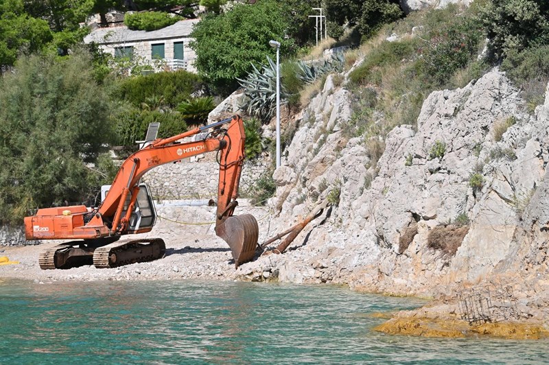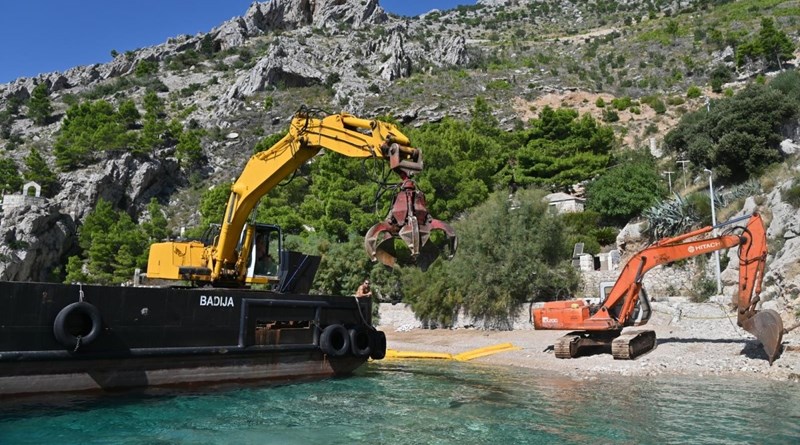 TRI MJESECA nakon početka rušenja ilegalno sagrađenih objekata u predivnoj uvali Vruja, između Brela i Omiša, bageri još uvijek rade na vraćanju ovog dijela obale u prvobitno stanje. Fotoreporter Pixsella snimio je jučer kako utovaruju građevinski otpad u brod.