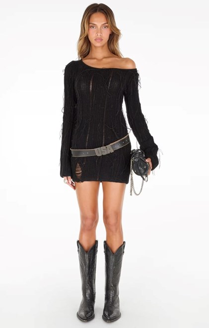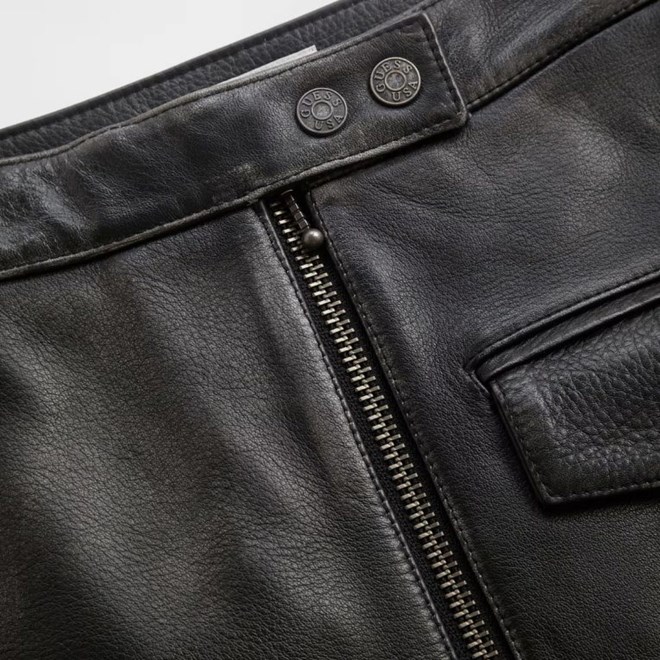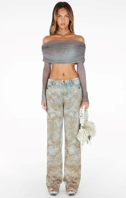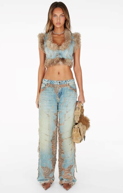 Prepoznatljiva igra s materijalima nastavlja se i ove sezone. Rustikalna ispucala koža sada je zamijenjena naboranim finišem na mikro minicama, jaknama i balonerima. Traper, kao okosnica brenda, dobiva novi život - kompleti djeluju rustikalno, a široke traperice ukrašene su uzorkom koji podsjeća na mrlje od nafte. Istrošeni izgled primjetan je i na klasičnom pletivu.