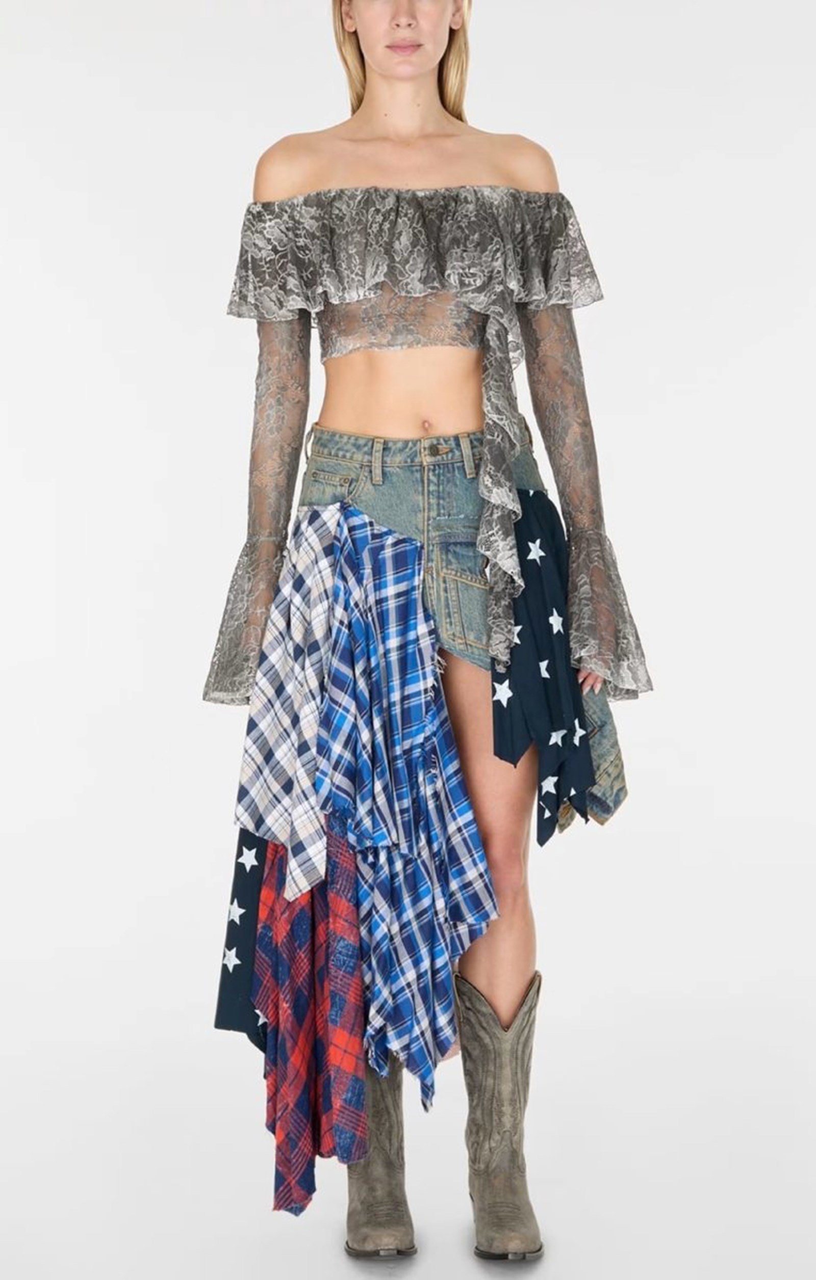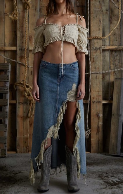 U fokusu su dramatično naglašena ramena i patchwork tehnika, dok istrošene tkanine i nostalgične siluete prizivaju duh prošlih vremena. Kolekcija zadržava prepoznatljivu seksi i senzualnu notu, vidljivu u minijaturnim traper hlačicama i prslucima, a cijela priča vizualno je smještena u autentični američki bar.