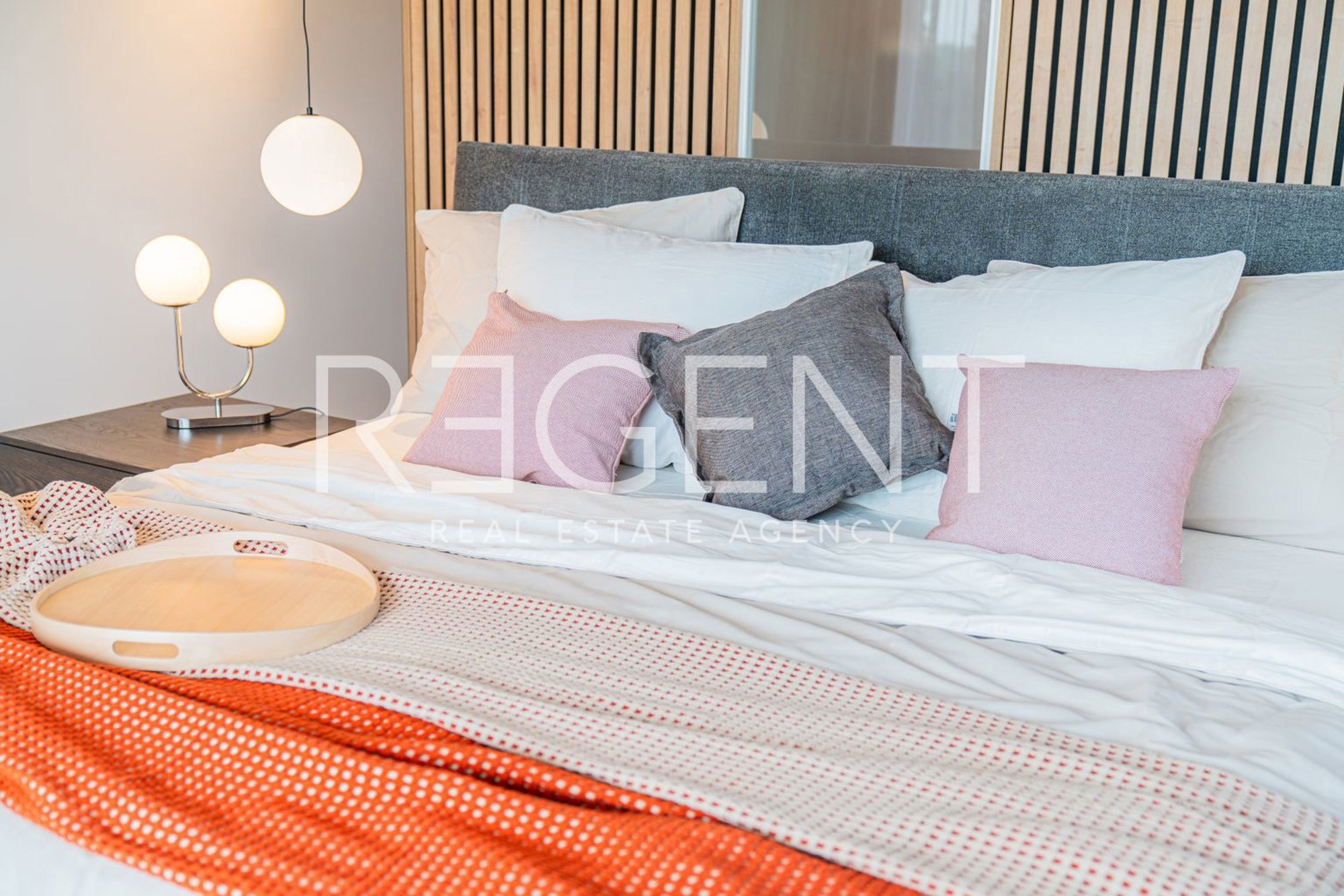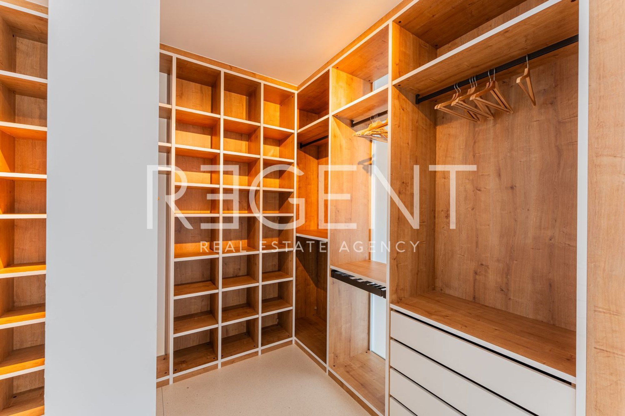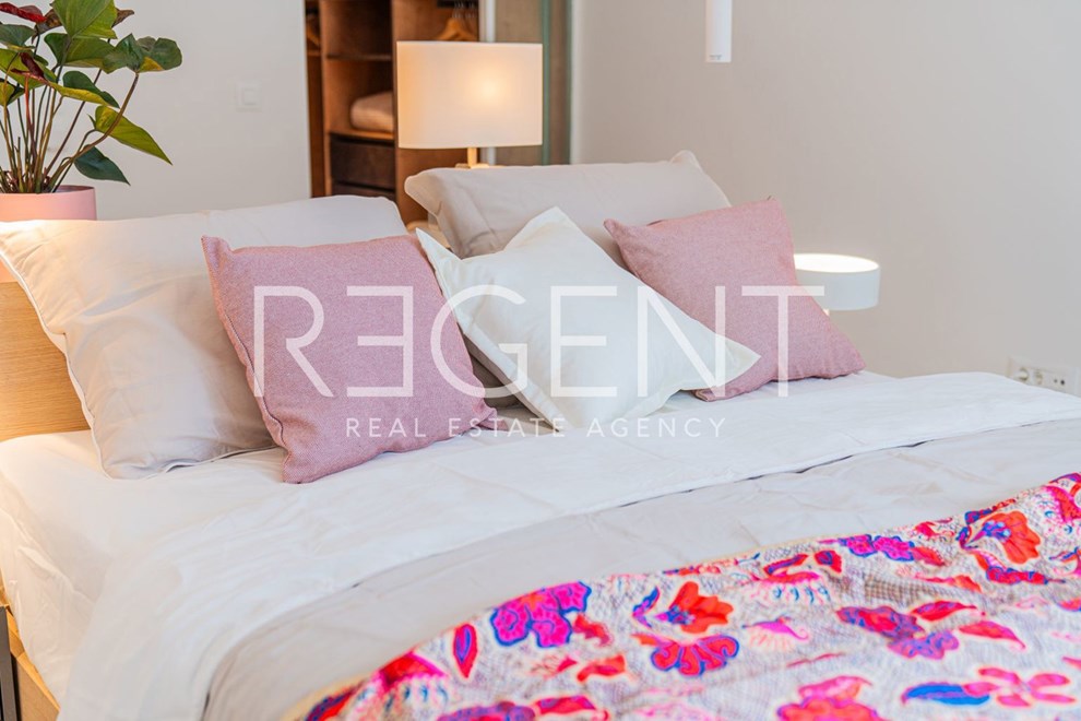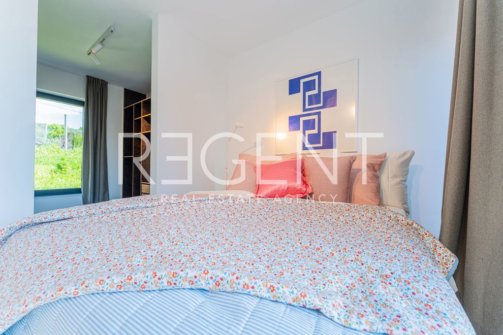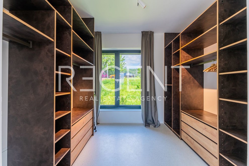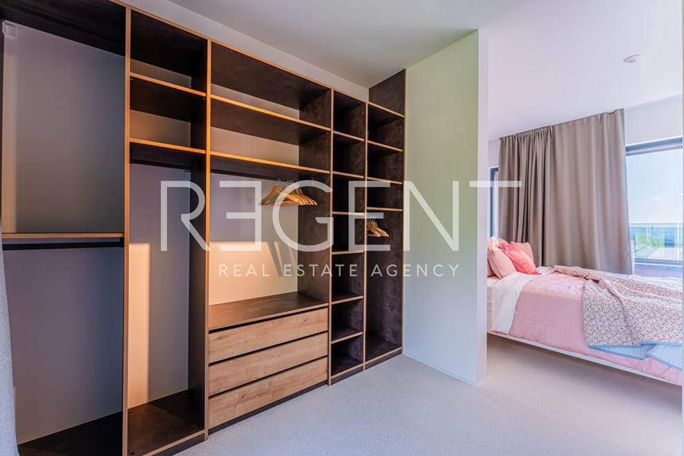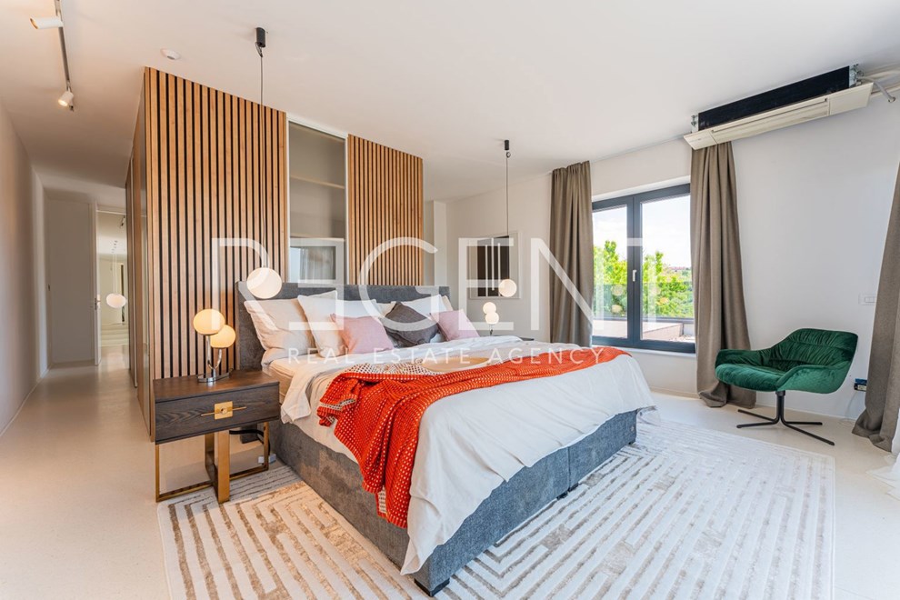 Na gornjoj etaži, odnosno katu, smješten je spavaći dio. U oglasu se navodi da se ondje nalazi glavna spavaća soba s garderobom, vlastitom kupaonicom i izlazom na terasu. Pored toga, na katu je i prostrani dječji spavaći apartman s kupaonicom, koji je, kako se ističe, moguće pregraditi u dvije odvojene spavaće sobe.