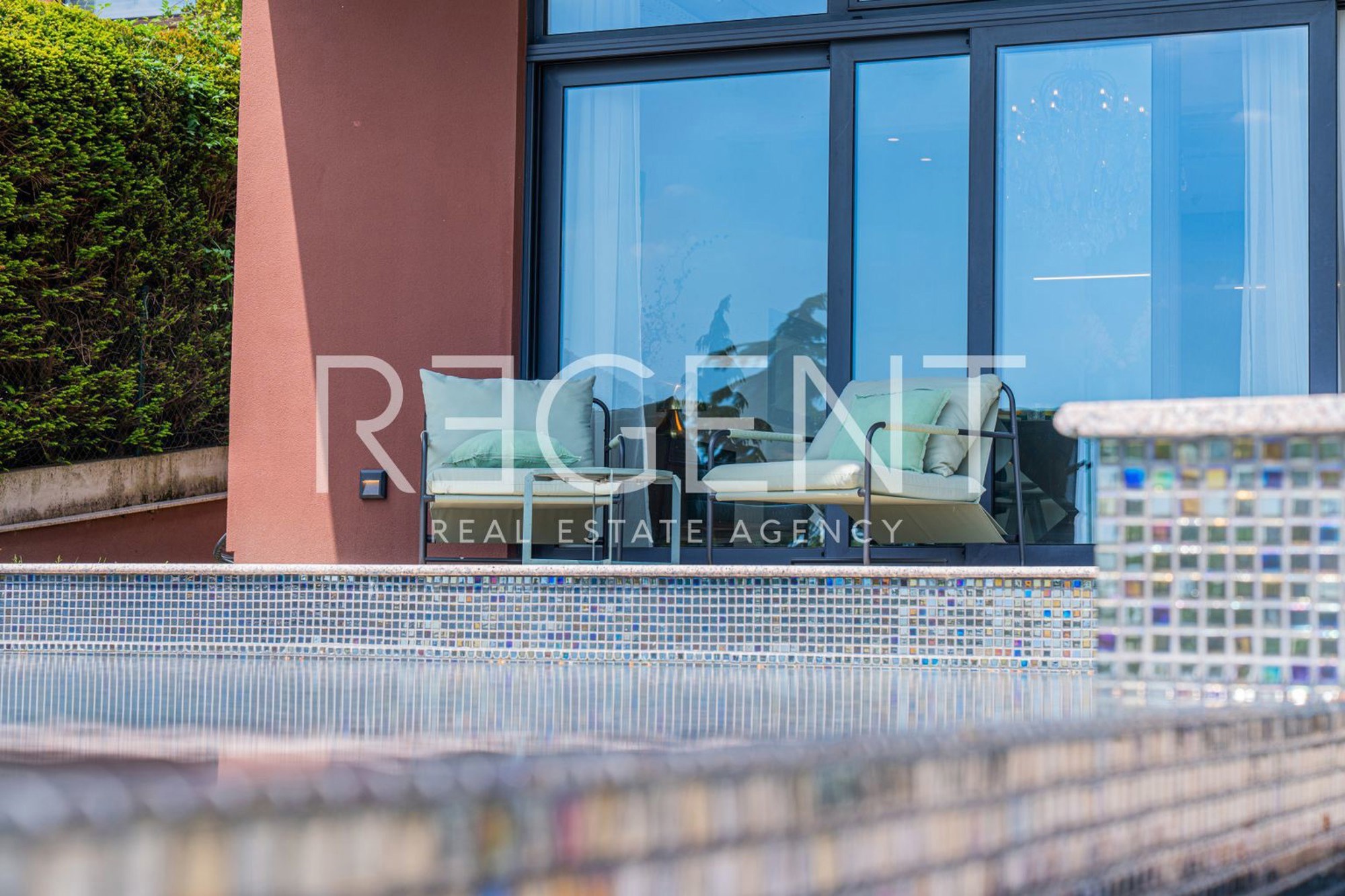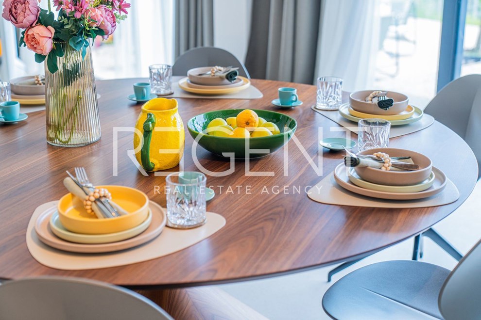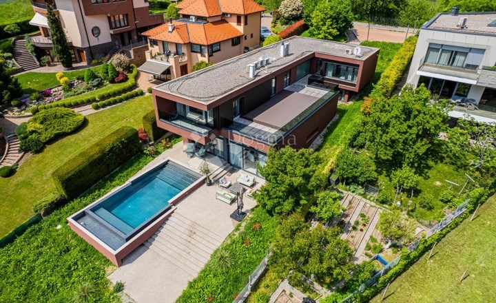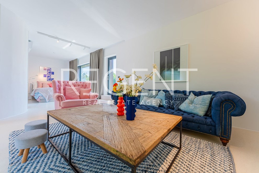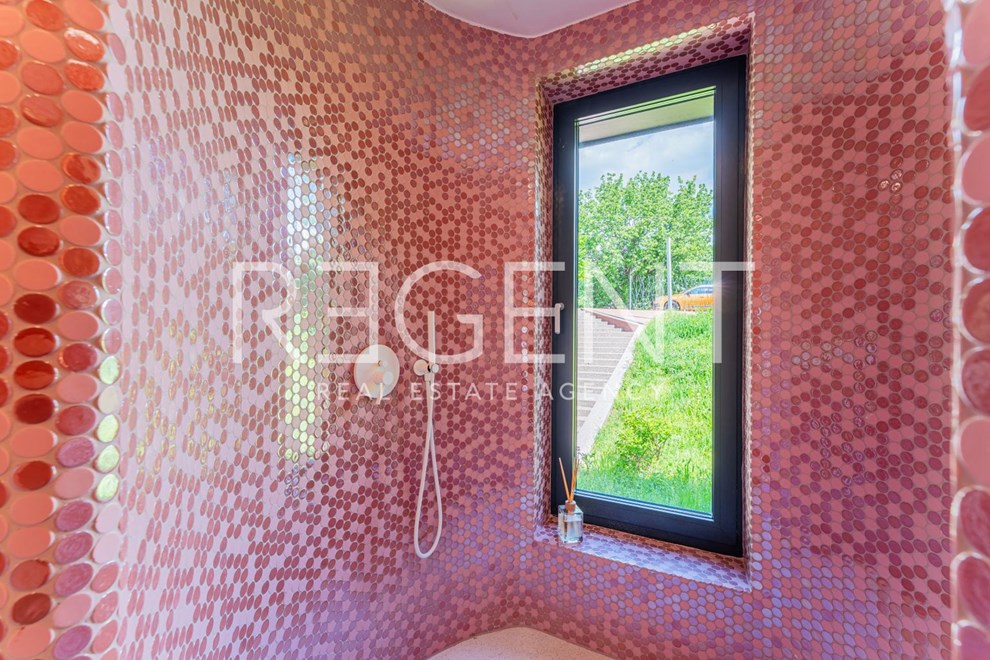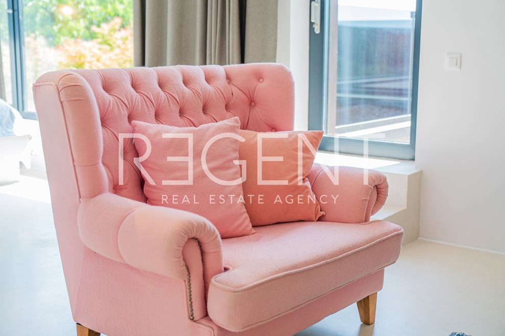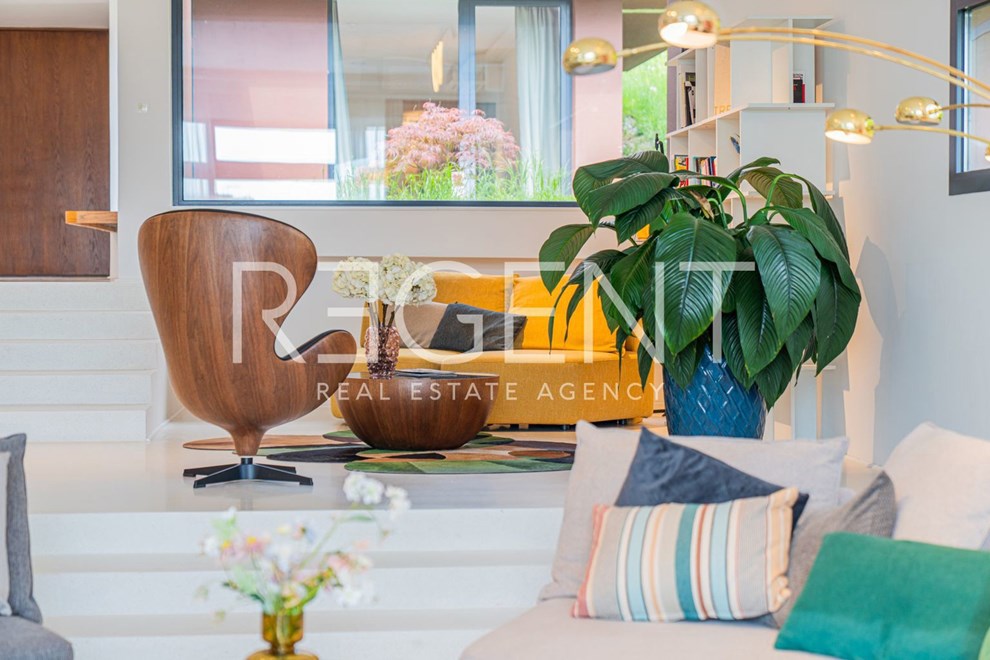 U oglasu je naglašeno da je kuća opremljena najsuvremenijim materijalima, uključujući visokokvalitetne podne obloge od terazza. Također, postoji i priprema za ugradnju solarnih panela. Kroz velike staklene stijene pruža se pogled na zelenilo i bazen, što doprinosi osjećaju prozračnosti i povezanosti s prirodom.