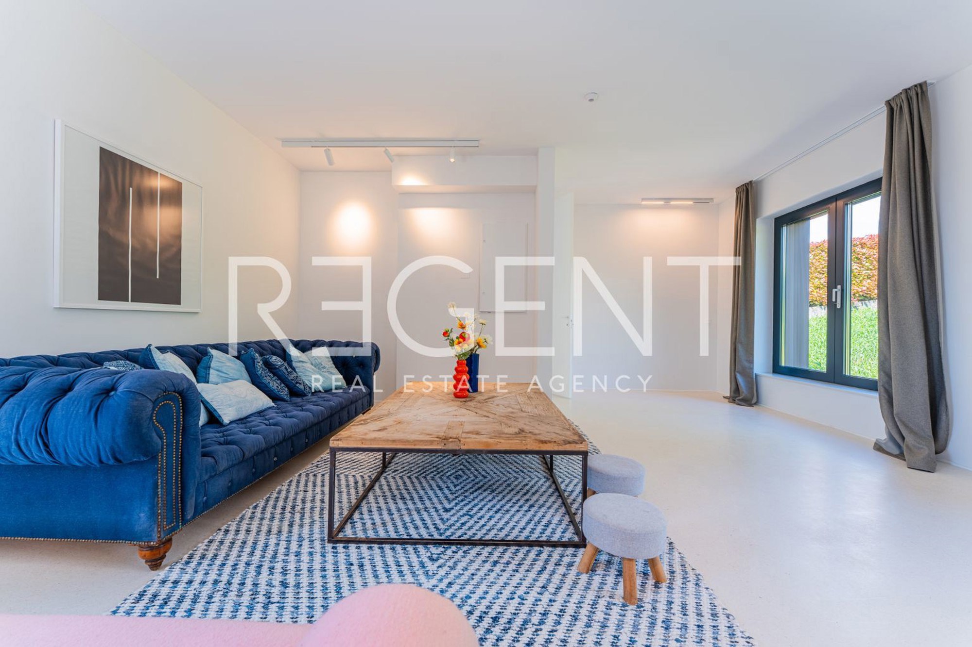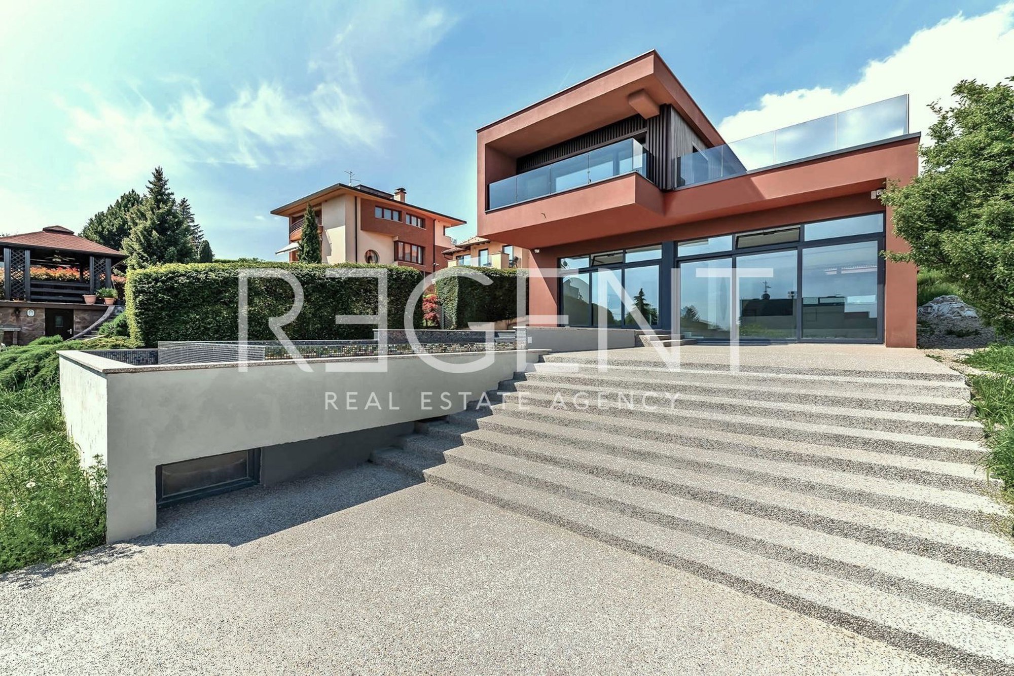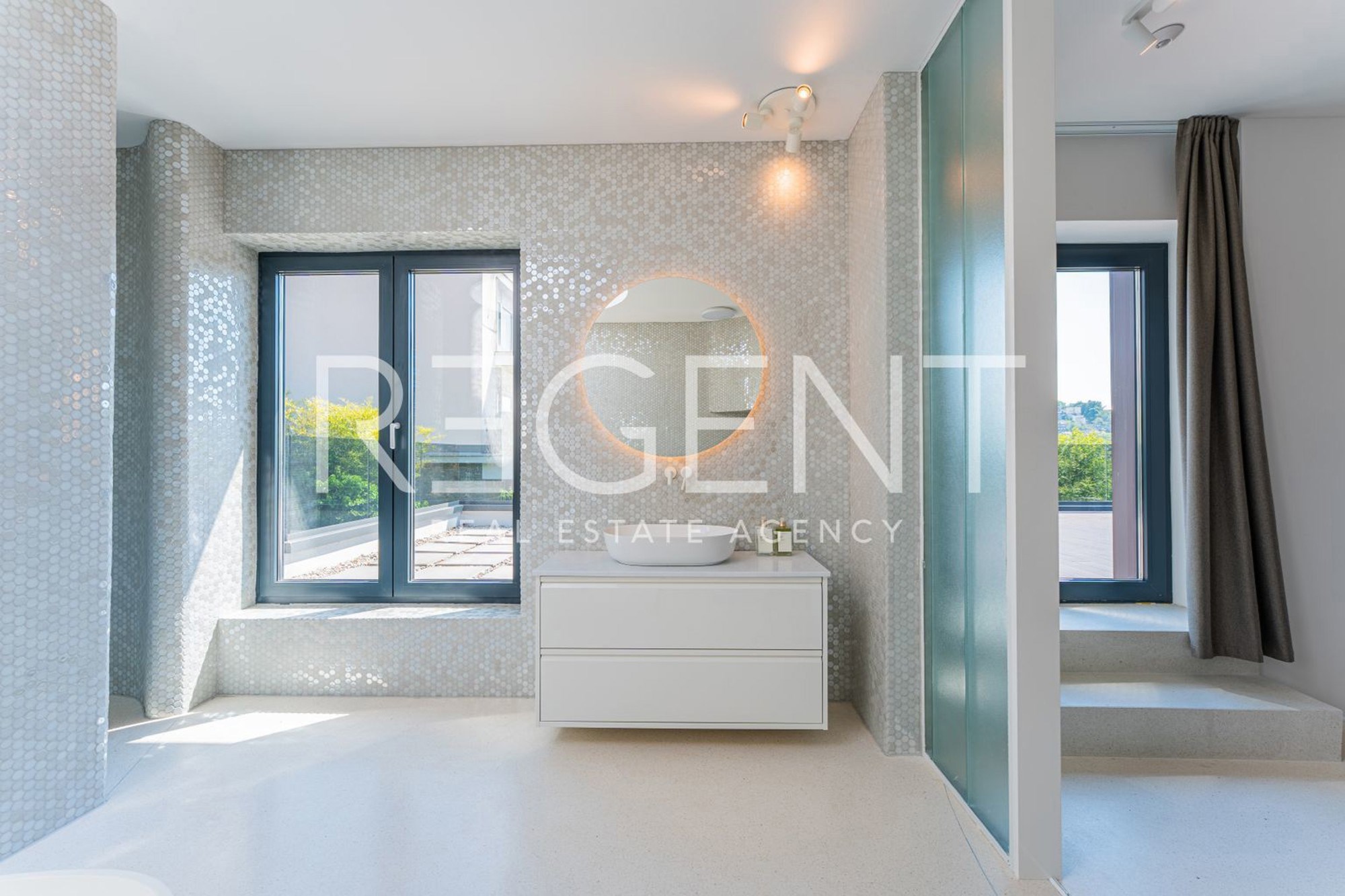 U oglasu je naglašeno da je kuća opremljena najsuvremenijim materijalima, uključujući visokokvalitetne podne obloge od terazza. Također, postoji i priprema za ugradnju solarnih panela. Kroz velike staklene stijene pruža se pogled na zelenilo i bazen, što doprinosi osjećaju prozračnosti i povezanosti s prirodom.