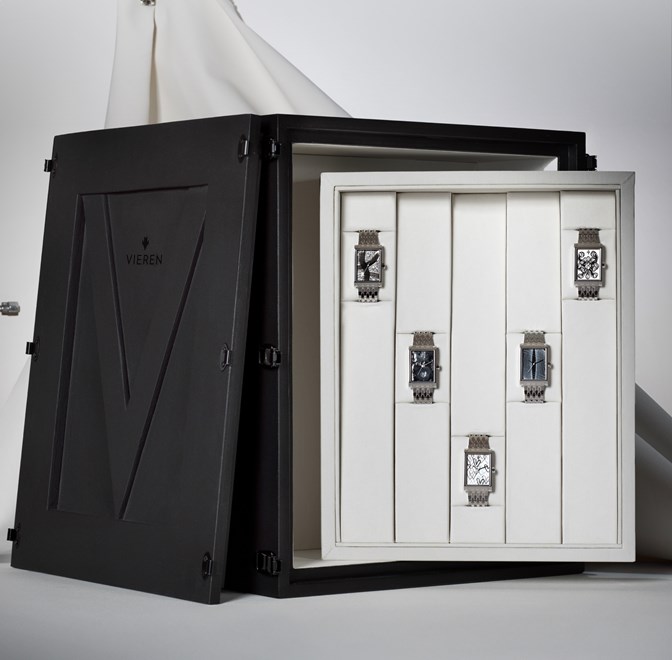 Glavna atrakcija Vieren V-kolekcije je pet ručno oslikanih brojčanika. Vieren je dodatno pojednostavio minimalistički izgled sata kako bi stvorio savršeno mat bijelu podlogu za svakog umjetnika.