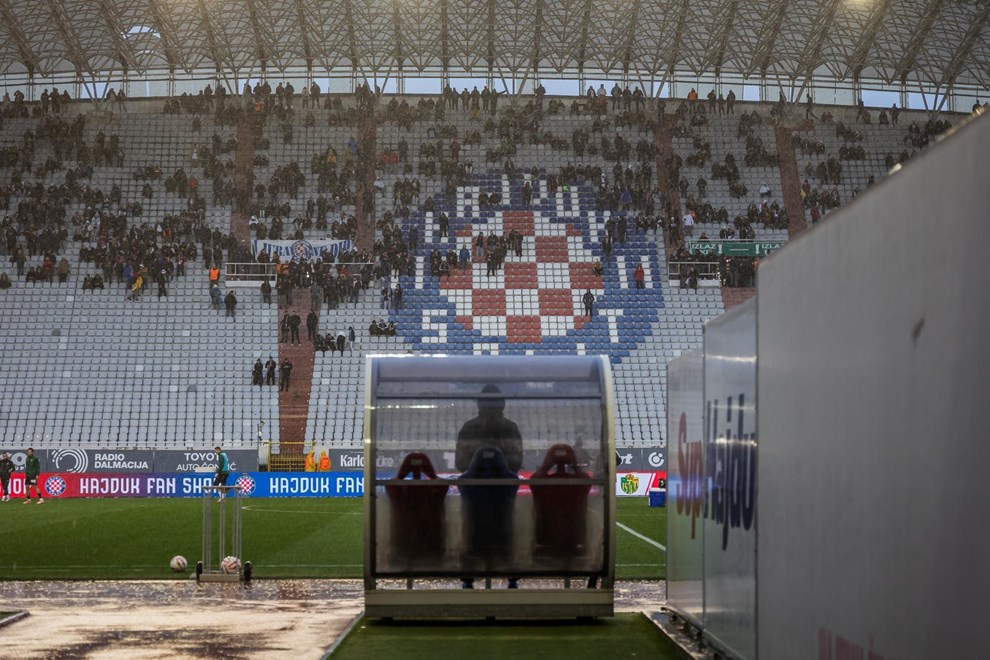 Jako pada kiša u Splitu, teren je natopljen, a navijači su se povukli pod krovove tribina. Stadion je daleko od ispunjenog.