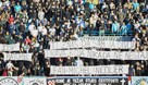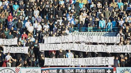 Prekid je utakmice. Navijači Hajduka ubacuju predmete u teren, a bacili su i baklju na tribinu na kojoj su navijači Cibalije.