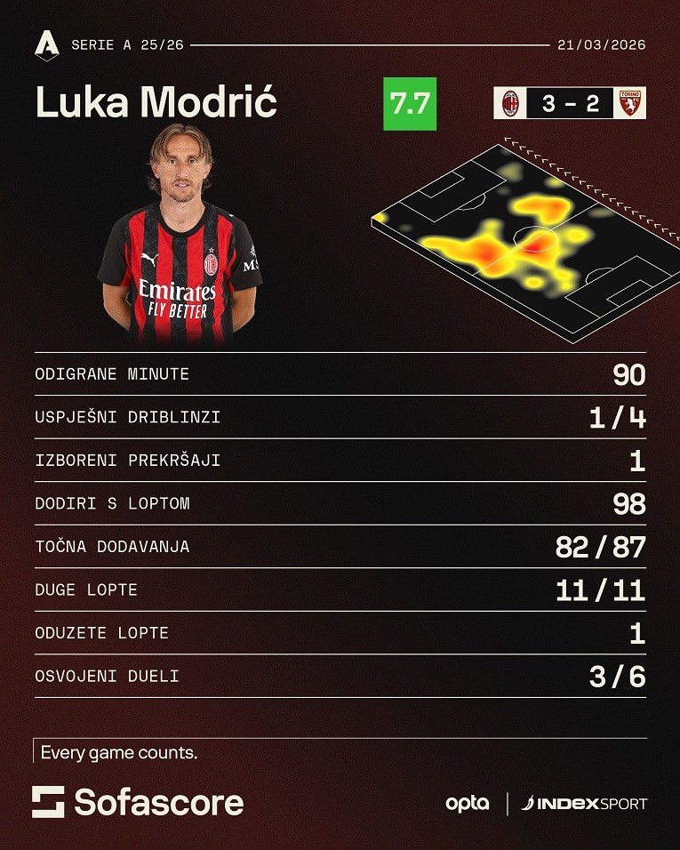 Modrićeva lopta izbacila je iz igre dva braniča Torina, a Amerikanac hrvatskih korijena ju je dostigao te iz prve zavrnuo pred gol, gdje je također iz prve zabio Adrien Rabiot. Nikola Vlašić je iz penala zabio počasni gol za Torino, ali osim toga bio je jako aktivan i opasan po gol Milana.