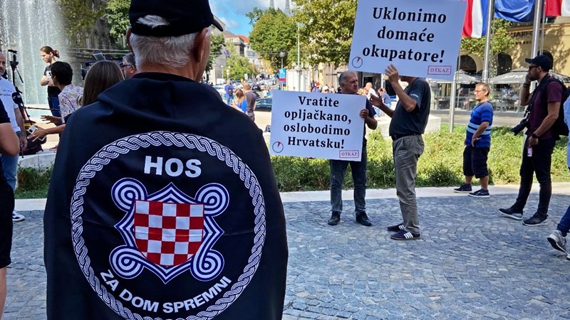 Oko fontane na Trgu žrtava fašizma okupilo se par tisuća prosvjednika, koji nose transparente s porukama poput "Vlast proizlazi iz naroda i pripada narodu", "Opet ste pokrali Inu", "Raseljena mladost je vaš uspjeh" i "Visoke cijene energenata su umjetno stvorene".