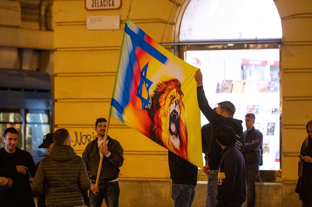 Na Trgu se pojavila i skupina mlađih muškaraca koji su razvili stiliziranu izraelsku zastavu. Jedan od njih je imao maskirano lice.